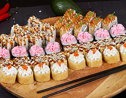 5 порций/40 кусочков: Кани темпура, Фрай, Тамаго спайси, Мраморный, Пинк флоид. (Временная замена в ролле Фрай на икру "тобико")
