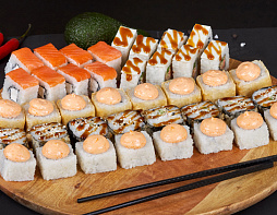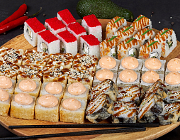 6 порций/48 кусочков: Оранж чикен, Грин чикен, Филадельфия с огурцом, Пиканто, Блэк милк, Трамп