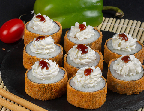 Темпура ролл с острыми стрипсами, омлетом, огурцом, сливочным сыром, соусом кабаяки