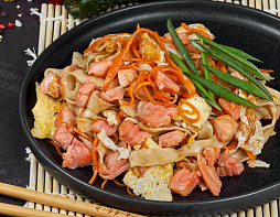 Филе лосося, морковь, омлет, зеленый лук. Подается с раменом