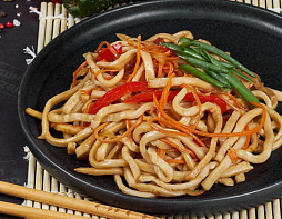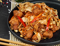 Куриное филе с овощами и орешками в остром соусе. Подается с раменом