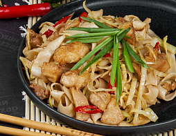 Куриное филе, белокочанная капуста, обжаренные в соусе "Терияки" с добавлением зеленого лука. Подается с раменом